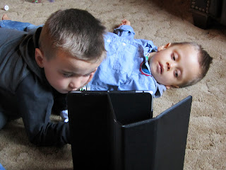 All the cousins loved Dakota's IPAD and he was a good cousin to share. Playing with Andrew.