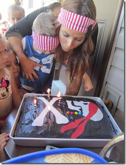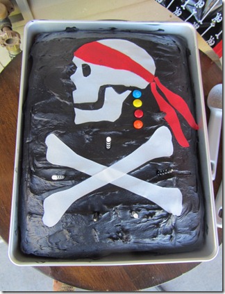 Had to have a pirate cake to go with it! This looks a lot more fancier then it really is…I just used the sugar sheets you can buy and cut out all the pieces and slapped them on there! All the kids wanted some of the head! ;)